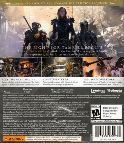 After 20 years of best-selling, award-winning fantasy role-playing games, the Elder Scrolls series goes online. Experience this multiplayer roleplaying game on your own or together with your friends, guild mates, and thousands of alliance members. Explore dangerous caves and dungeons in Skyrim, or craft quality goods to sell in the city of Daggerfall. Embark upon adventurous quests across Tamriel and engage in massive player versus player battles, or spend your days at the nearest fishing hole or reading one of many books of lore. Use any weapon or armor at any time and customize your abilities to play the way you want. The choices are yours and the decisions you make will shape your destiny and the persistent world of The Elder Scrolls Online: Tamriel Unlimited.