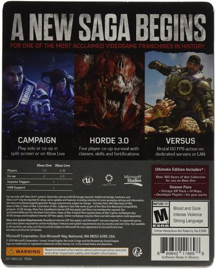 A new saga begins for one of the most acclaimed video game franchises in history. After narrowly escaping an attack on their village, JD Fenix and his friends, Kait and Del, must rescue the ones they love and discover the source of a monstrous new enemy. "Gears of War 4" returns the franchise to the dark tone and intensity of the original and includes split-screen and online co-op, the next generation of five-player favorite, Horde Mode, 60 frames-per-second Versus multiplayer, and stunning visuals powered by Unreal Engine 4.