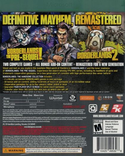 DEFINITIVE MAYHEM, REMASTERED! Borderlands: The Handsome Collection is the essential Borderlands compilation and includes the definitive versions of both Borderlands 2 and Borderlands: The Pre-Sequel, built specifically for next-gen consoles. PlayStation 4 and Xbox One customers will experience the absolute highest performance and highest fidelity graphics for any Borderlands game ever played on a video game console. For the first time in the franchise's history, play four-player split screen on a single television, all in stunning high definition.