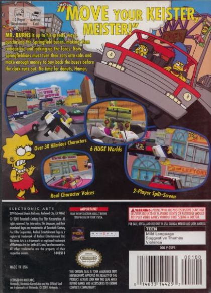 The Simpsons Road Rage™ blends renowned Simpsons wit and edge-of-your-seat racing action to create a fun, reckless and riotously funny arcade-style driving game. In this new interactive Simpsons episode, players can take control of one of 22 of their favorite characters including Apu, Barney and Marge, as they embark on the wacky, but skill-based missions. In order to earn enough money to buy back the Transit Corporation from Mr. Burns, gamers must drive through the city picking up passengers and taking them where they want to go. Players must drive like hell, crash through obstacles, dodge traffic or bash their way through passengers and cargo before time runs out.