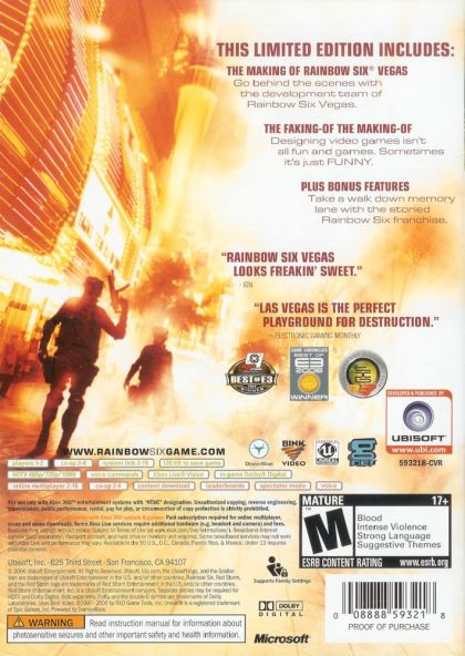 Tom Clancy's Rainbow Six makes its next-generation hardware debut in the most dramatic installment of the renowned first-person shooter franchise to date. Rainbow operatives take to the chaotic streets of Las Vegas as an escalating terrorist siege in Sin City threatens to take world terrorism to new, uncontrollable heights. The future of global security hangs in the balance as you battle to defend classic Vegas locations and environments like Fremont Street, the Strip and casinos. Experience Las Vegas like never before – through revolutionary next generation technology as you work against the clock to protect one of the world's most recognizable cities from utter devastation.