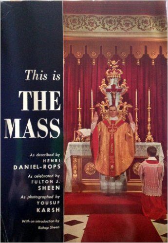 Henri Daniel-Rops describes each step of the Mass, explaining the step's history and significance, followed by a prayer for the reader's use in meditations during the Mass. The text is illustrated by photographs of Bishop Fulton J. Sheen celebrating the Mass.