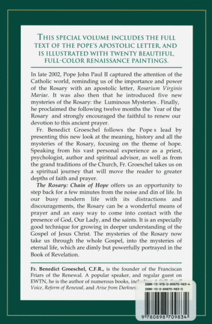Meditations on the Rosary, including the new Luminous Mysteries. In the Fall of 2002 the Catholic world, and even the secular media, all expressed a delighted surprise and enthusiam when Pope John Paul II announced he was introducing five new mysteries of the rosary. These new "Luminous Mysteries" have inspired Fr. Benedict Groeschel to write this new book of profound meditations on the mysteries of the rosary. Speaking from personal experience as well as from the grand traditions of the Church, Fr. Groeschel takes us on a spiritual journey that will move the reader to greater depths of faith. Accompanied by the full text of Pope John Paul II's Apostolic Letter on the rosary, Rosarium Virginis Mariae, this book is a jewel of spiritual insight that will continue to inspire for years to come.