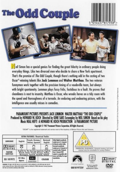 In New York, Felix, a neurotic news writer who just broke up with his wife, is urged by his chaotic friend Oscar, a sports journalist, to move in with him, but their lifestyles are as different as night and day are, so Felix's ideas about housekeeping soon begin to irritate Oscar.