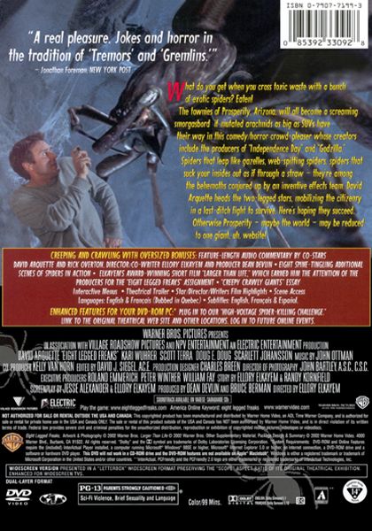 The residents of a rural mining town discover that an unfortunate chemical spill has caused hundreds of little spiders to mutate overnight to the size of SUVs. It's then up to mining engineer Chris McCormack and Sheriff Sam Parker to mobilize an eclectic group of townspeople, including the Sheriff's young son, Mike, her daughter, Ashley, and paranoid radio announcer Harlan, into battle against the bloodthirsty eight-legged beasts.