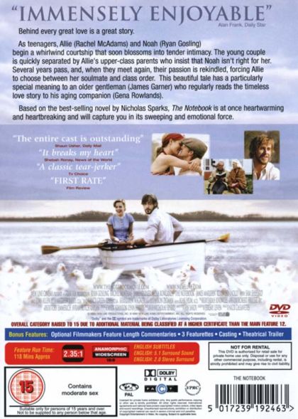 An epic love story centered around an older man who reads aloud to a woman with Alzheimer's. From a faded notebook, the old man's words bring to life the story about a couple who is separated by World War II, and is then passionately reunited, seven years later, after they have taken different paths.