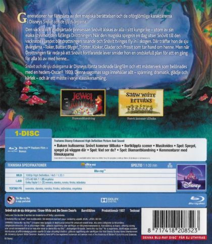 The first, and by far most memorable full-length animated feature from the Disney Studios, "Snow White and the Seven Dwarfs" may have been superseded technically by many of the films that followed it. But its simple story of a charming little princess saved from the evil deeds of her wicked step-mother, the queen, by a group of seven adorable dwarfs made history when it was first released in December, 1937 and has since become an incomparable screen classic.