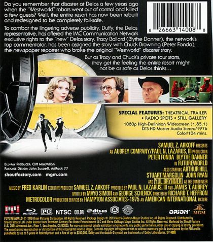 Two years after the Westworld tragedy in the Delos amusement park, the corporate owners have reopened the park following over $1 billion in safety and other improvements. For publicity purposes, reporters Chuck Browning (Fonda) and Tracy Ballard (Danner) are invited to review the park. Just prior to arriving at the park, however, Browning is given a clue by a dying man that something is amiss.