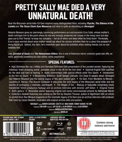 A man living in rural Wisconsin takes care of his bed-ridden mother, who is very domineering and teaches him that all women are evil. After she dies, he misses her, and a year later digs her up and takes her home. He learns about taxidermy and begins robbing graves to get materials to patch her up, and inevitably begins looking for fresher sources of materials. Based loosely on the true story of Ed Gein.