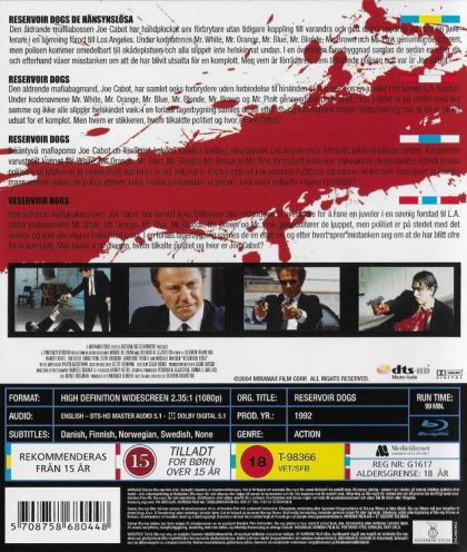 A botched robbery indicates a police informant, and the pressure mounts in the aftermath at a warehouse. Crime begets violence as the survivors -- veteran Mr. White, newcomer Mr. Orange, psychopathic parolee Mr. Blonde, bickering weasel Mr. Pink and Nice Guy Eddie -- unravel.