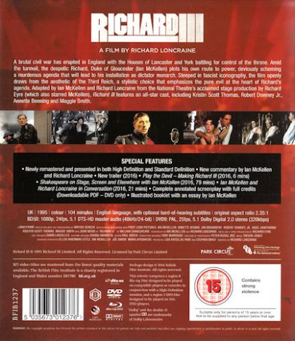 A murderous lust for the British throne sees Richard III (Ian McKellen) descend into madness. Though the setting is transposed to the 1930s, England is torn by civil war, split between the rivaling houses of York and Lancaster. Richard aspires to a fascist dictatorship, but must first remove the obstacles to his ascension -- among them his brother, his nephews and his brother's wife (Annette Bening). When the Duke of Buckingham (Jim Broadbent) deserts him, Richard's plans are compromised.