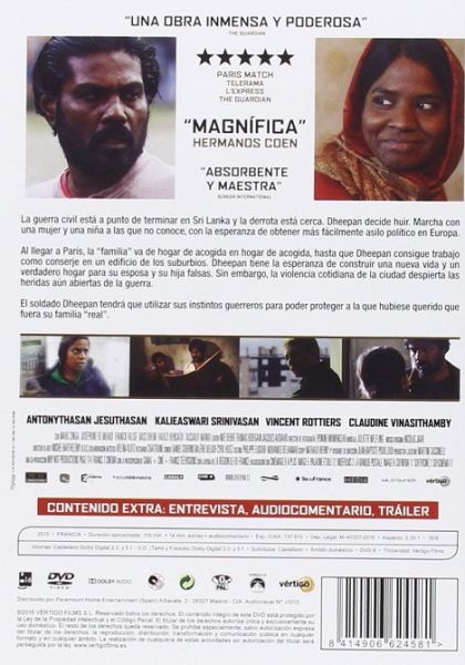 Three war-torn strangers posing as a family flee Sri Lanka’s civil war to start over in a troubled Paris suburb, but their past traumas resurface as they struggle to survive in their new environment.