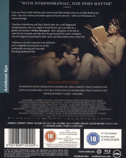 A man named Seligman finds a fainted wounded woman in an alley and he brings her home. She tells him that her name is Joe and that she is nymphomaniac. Joe tells her life and sexual experiences with hundreds of men since she was a young teenager while Seligman tells about his hobbies, such as fly fishing, reading about Fibonacci numbers or listening to organ music.
