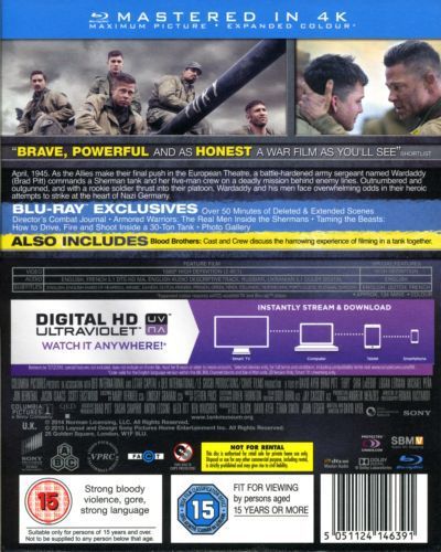 April, 1945. As the Allies make their final push in the European Theatre, a battle-hardened army sergeant named Wardaddy commands a Sherman tank and her five-man crew on a deadly mission behind enemy lines. Outnumbered and outgunned, and with a rookie soldier thrust into their platoon, Wardaddy and his men face overwhelming odds in their heroic attempts to strike at the heart of Nazi Germany.