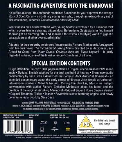 A dangerous combination of radiation and insecticide causes the unfortunate Scott Carey to shrink, slowly but surely, until he is only a few inches tall. His home becomes a wilderness where he must survive everything from spiders living in the cellar to his beloved cat.