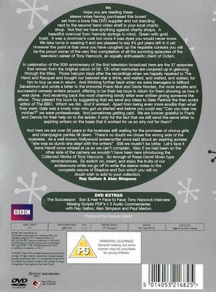 This collection contains all 37 surviving episodes, from 1956 to 1961, of the classic sitcom written by Galton and Simpson featuring East Cheam's most famous resident, Tony Hancock.