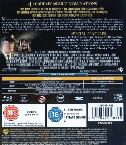 A supernatural tale set on death row in a Southern prison, where gentle giant John Coffey possesses the mysterious power to heal people's ailments. When the cell block's head guard, Paul Edgecomb, recognizes Coffey's miraculous gift, he tries desperately to help stave off the condemned man's execution.