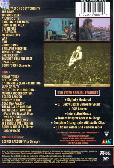 A complete collection of all videos released by Bruce Springsteen & The E Street Band from 1978 until 2000. Videos include "Rosalita (Come Out Tonight)" "Thunder Road," Atlantic City 5. "Dancing In The Dark," "Born In The U. S.A.," "Glory Days," "My Hometown," "War," "Fire," "Born To Run," "Tunnel Of Love," "57 Channels (And Nothin' On)," "Streets Of Philadelphia," "The Ghost Of Tom Joad," and "Hungry Heart."