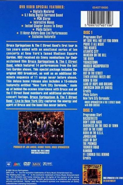 A two disc amalgam of the final performances of 2001's Madison Square Gardens performances by one of the greatest bands in the world of some of the greatest music in the world. The atmosphere positively floods out of the screen to envelop you and the hairs on your neck will be standing on end before the first note has been struck. After watching this you'll believe that The Boss is incapable of putting a foot wrong. By the end, he's only just short of defying gravity.