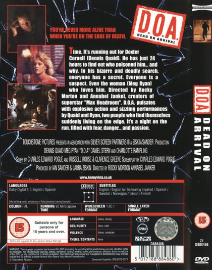 D.O.A is the story of a washed up English College Professor, Dexter Cornell (Dennis Quaid) who finds the people around him who are close to him have been murdered. It all began with Nick Lang (Robert Knepper) who Dexter passed along a manuscript to read. Nick ends up dead only to have Nick traced back to an affair with his wife. One by one a new murder leads back to Dexter himself. However now, Dexter has become the prime suspect and also prime victim. Someone has just slipped something deadly into Dexter’s drink and poisoned him. Now Dexter has only 24 hours to find out who and how to stop it. Along the way, Dexter takes up a partnership with one of his students, Sydney Fuller (Meg Ryan) who helps him deal with his search in more ways than one.