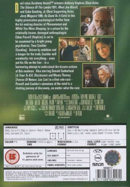 Dr. Ethan Powell, an anthropologist, is in Africa studying apes when he is lost for two years. When he is found, he kills 3 men and puts 2 in the hospital. Cuba Gooding's character is a psychiatrist who wants to take up the task of trying to get Dr. Powell to speak again and maybe even stand judgment at a trial for his release from prison of mental cases. Along the way, Cuba has to deal with also helping the mental patients that are being abused and neglected. In this process Cuba learns a few things about himself and life, and so does Anthony Hopkins character, Dr. Powell.