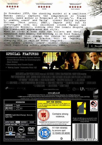 Capote is the biographical film about writer Truman Capote and his assignment for The New Yorker to write the non-fiction book In Cold Blood. Philip Seymour Hoffman won an Oscar for Best Actor for his portrayal of Capote.
