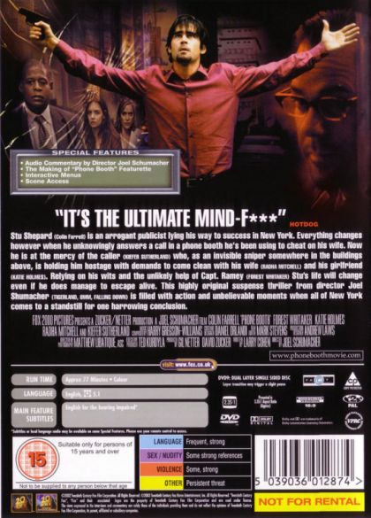 A slick New York publicist who picks up a ringing receiver in a phone booth is told that if he hangs up, he'll be killed... and the little red light from a laser rifle sight is proof that the caller isn't kidding.