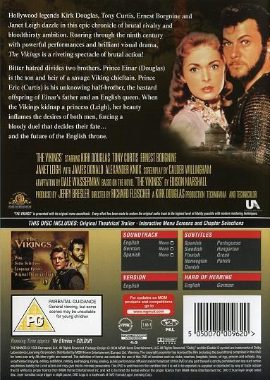 Hollywood legends Kirk Douglas, Tony Curtis, Ernest Borgnine and Janet Leigh dazzle in this epic chronicle of brutal rivalry and bloodthirsty ambition. Roaring through the ninth century with powerful performances and brilliant visual drama, The Vikings is a riveting spectacle of brutal action! Bitter hatred divides two brothers. Prince Einar is the son and heir of a savage Viking chieftain. Prince Eric is his unknowing half-brother, the b**tard offspring of Einar's father and an English queen. When the Vikings kidnap a princess, her beauty inflames the desires of both men, forcing a bloody duel that decides their fate... and the future of the English throne.