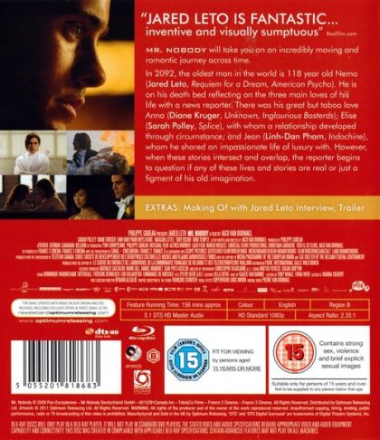 Nemo Nobody leads an ordinary existence at his wife's side, Elise, and their 3 children until the day when reality skids and he wakes up as an old man in the year 2092. At 120, Mr. Nobody is both the oldest man in the world and the last mortal of a new mankind where nobody dies anymore. But that doesn't seem to interest or bother him very much. The only questions that preoccupy him in the present is whether he lived the right life for himself, loved the woman whom he was supposed to love, and had the children whom he was meant to have... now his purpose is to find the right answer.