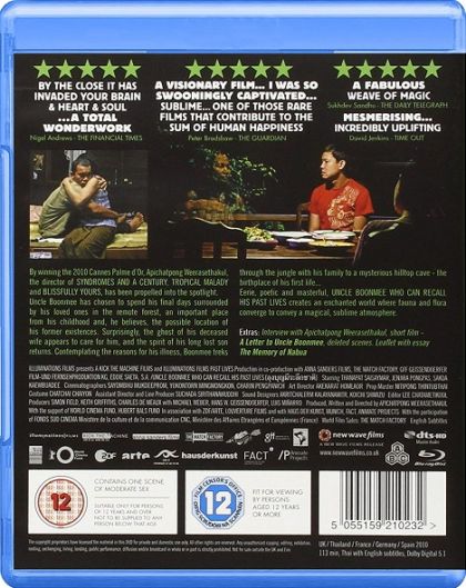 Suffering from acute kidney failure, Boonmee has chosen to spend his final days surrounded by his loved ones in the countryside. Surprisingly, the ghost of his deceased wife appears to care for him, and his long lost son returns home in a non-human form. Contemplating the reasons for his illness, Boonmee treks through the jungle with his family to a mysterious hilltop cave—the birthplace of his first life.