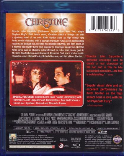 Nerdy high schooler Arnie Cunningham falls for Christine, a rusty 1958 Plymouth Fury, and becomes obsessed with restoring the classic automobile to her former glory. As the car changes, so does Arnie, whose newfound confidence turns to arrogance behind the wheel of his exotic beauty. Arnie's girlfriend Leigh and best friend Dennis reach out to him, only to be met by a Fury like no other.