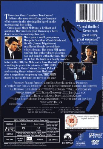 Mitch McDeere is a young man with a promising future in Law. About to sit his Bar exam, he is approached by 'The Firm' and made an offer he doesn't refuse. Seduced by the money and gifts showered on him, he is totally oblivious to the more sinister side of his company. Then, two Associates are murdered. The FBI contact him, asking him for information and suddenly his life is ruined. He has a choice - work with the FBI, or stay with the Firm. Either way he will lose his life as he knows it. Mitch figures the only way out is to follow his own plan...
