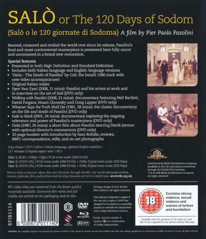 Set in the Nazi-controlled, northern Italian state of Salo in 1944, four dignitaries round up sixteen perfect specimens of youth and take them together with guards, servants and studs to a palace near Marzabotto. In addition, there are four middle-aged women: three of whom recount arousing stories whilst the fourth accompanies on the piano. The story is largely taken up with their recounting the stories of Dante and De Sade: the Circle of Manias, the Circle of Shit and the Circle of Blood. Following this, the youths are executed whilst each libertine takes his turn as voyeur.