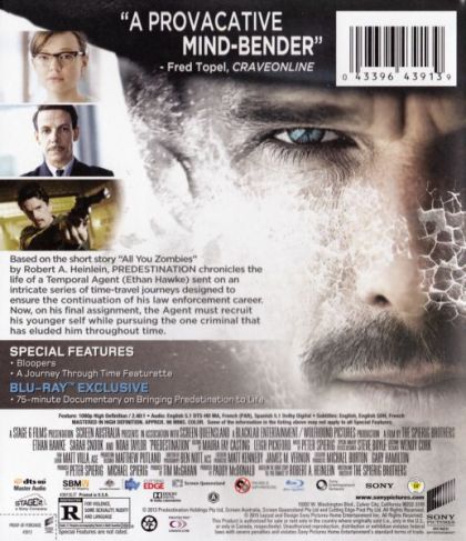 Predestination chronicles the life of a Temporal Agent (Ethan Hawke) sent on an intricate series of time-travel journeys designed to prevent future killers from committing their crimes. Now, on his final assignment, the Agent must stop the one criminal that has eluded him throughout time and prevent a devastating attack in which thousands of lives will be lost.
