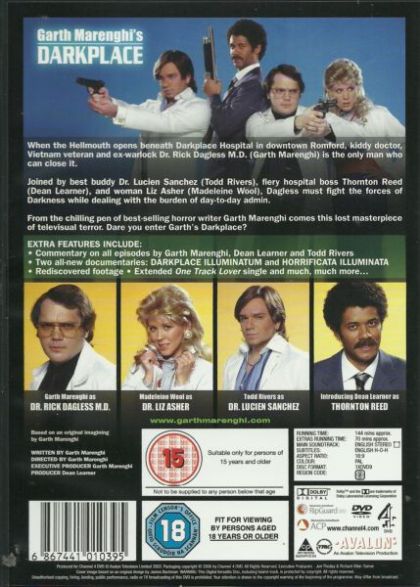 Garth Marenghi's Darkplace is the brainchild of celebrated horror writer and self-styled "fabulist" Garth Marenghi, author of such genre classics as Afterbirth (a mutated placenta attacks Bristol) and Crab! ("One of the three best horror books about crabs I've ever read" - Hard Gore Magazine). Back in the 1980s, he branched out into television production, writing and starring in a series so radical, so scary and so downright crazy that when the bosses of Channel 4 saw what they had on their hands, they ran away screaming, like little girls. Only now, twenty years on and amid the worst programming drought in television history, have the station finally allowed the show on the air. Intercut with new interviews with Marenghi himself and his co-stars Dean Learner and Todd Rivers, Garth Marenghi's Darkplace is perhaps the most disturbing vision of hospital life ever broadcast.