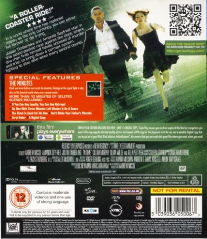 In the not-too-distant future, the aging gene has been switched off. To avoid overpopulation, time has become the currency and the way people pay for luxuries and necessities. The rich can live forever, while the rest struggle to negotiate for their immortality. A poor young man who suddenly comes into a fortune of time finds himself on the run from a corrupt police force known as the "time keepers".