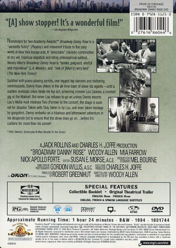 Broadway Danny Rose is a 1984 American black-and-white comedy film written, directed by and starring Woody Allen. It was screened out of competition at the 1984 Cannes Film Festival. A hapless talent manager named Danny Rose, by helping a client, gets dragged into a love triangle involving the mob. His story is told in flashback, an anecdote shared amongst a group of comedians over lunch at New York's Carnegie Deli. Rose's one-man talent agency represents countless incompetent entertainers, including a one-legged tap dancer, and one slightly talented one: washed-up lounge singer Lou Canova (Nick Apollo Forte), whose career is on the rebound.
