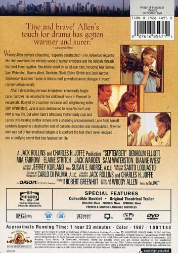 September is a 1987 film written and directed by Woody Allen. Allen's intention of September was to be like "a play on film," thus the great number of long takes and few camera effects.
