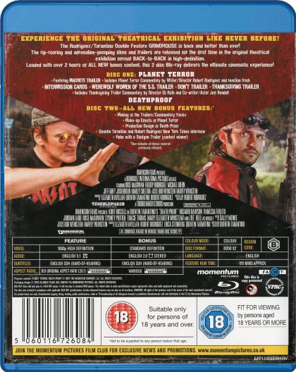 A double-bill of thrillers that recall both filmmakers' (Quentin Tarantino & Robert Rodriguez) favorite exploitation films. "Grindhouse" (a downtown movie theater in disrepair since its glory days as a movie palace known for "grinding out" non-stop double-bill programs of B-movies) is presented as one full-length feature comprised of two individual films helmed separately by each director. "Death Proof," is a rip-roaring slasher flick where the killer pursues his victims with a car rather than a knife, while "Planet Terror" shows us a view of the world in the midst of a zombie outbreak. The films are joined together by clever faux trailers that recall the '50s exploitation drive-in classics.