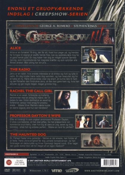 This follow-up to the George Romero/Stephen King-launched anthology series features five new tales of horror and a wraparound. The main stories deal with alternative realities ("Alice"), possessed communication devices ("The Radio"), vampires and serial killers in lust ("Call Girl"), mad inventors ("The Professor's Wife"), and hauntings from beyond the grave ("Haunted Dog").