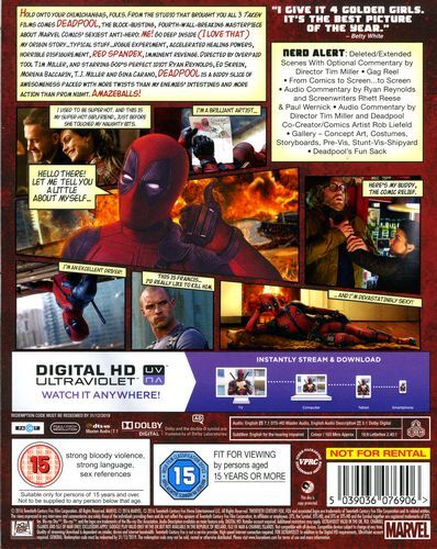 Based upon Marvel Comics’ most unconventional anti-hero, DEADPOOL tells the origin story of former Special Forces operative turned mercenary Wade Wilson, who after being subjected to a rogue experiment that leaves him with accelerated healing powers, adopts the alter ego Deadpool. Armed with his new abilities and a dark, twisted sense of humor, Deadpool hunts down the man who nearly destroyed his life.