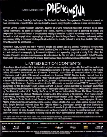Jennifer Corvino (Jennifer Connelly, Labyrinth), daughter of a world-renowned movie star, arrives in the so-called Swiss Transylvania to attend an exclusive girls school. However, a vicious killer is targeting the pupils, and sleepwalker Jennifer finds herself in the assassin s headlights when her nocturnal wanderings cause her to witness the death of a fellow pupil. Aided by paraplegic etymologist John McGregor (Donald Pleasence, Halloween) and her own uncanny ability to communicate telepathically with insects, Jennifer sets out to track down the killer before she herself becomes the latest victim...Released in 1985, towards the end of Argento s decade-long golden age as a director, Phenomena co-stars Dalila Di Lazarro (Flesh for Frankenstein), Patrick Bauchau (Clear and Present Danger) and Daria Nicolodi (Tenebrae), and features lush cinematography by Romano Albani (Inferno) and a pounding prog rock score by Goblin (Deep Red, Suspiria). Presented here in a sumptuous new 4K restoration of the film and a newly created hybrid English/Italian audio track on the full length 116-minute Italian version, this is the definitive release of Argento s creepy classic.