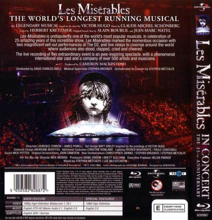 This concert, recorded to celebrate the 25th anniversary of the landmark musical Les Miserables, gathers the casts of the show's 2010 original production at the Queen's Theatre, the 1985 original production by the London company, and the 2010 production at the Barbican together for one performance. Together with talents like Michael Ball, Hadley Fraser, and John Owen-Jones, the performers present the play's musical numbers in a semi-theatrical style, fully costumed and with all the emotion of the musical's heyday.