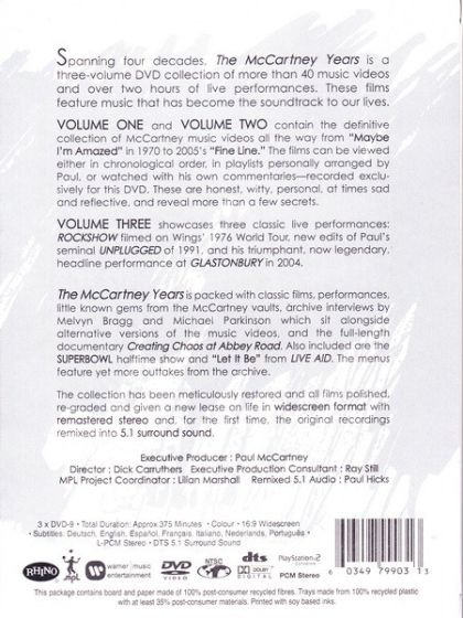The McCartney Years is a three-DVD set featuring music videos, live performances and other rare footage from Paul McCartney's solo career and Wings. The set spans the years 1970 to 2005 The first two discs comprise promotional films, from "Maybe I'm Amazed" (1970) to "Fine Line" (2005). Additional features include a documentary about his recent album Chaos and Creation in the Backyard (Creating Chaos at Abbey Road), a film about the Band on the Run album and a feature-length audio commentary from McCartney himself. The third disc includes seven songs from the 1976 Wings concert Rockshow, four songs from McCartney's 1991 appearance on MTV Unplugged, and eleven performances from his 2004 set at Glastonbury Festival. The live footage is also complemented by an optional commentary by McCartney. Other features includes his appearance at Live Aid in 1985, the Super Bowl XXXIX Halftime Show and interviews with Melvyn Bragg and Michael Parkinson.