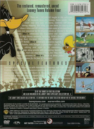 More Looney Tunes. Your wish is our command. Because in this 4-disc set are 60 more of the most looneytic Looney Tunes ever unleashed on rabbits, pigs, mice or cats. Indeed, some have never before been on home video! Disc 1 features the tall, gray and haresome one. Disc 2 is all pig. Disc 3 is all about Speedy. And Disc 4 is the cats meow. One thing: to watch these, you must be as tall as this sign. Wrong disclaimer. Read the one in the box below. Got the idea? Now have fun
