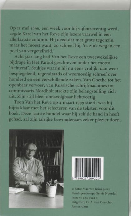 Acht jaar lang had Van het Reve een tweewekelijkse bijdrage in Het Parool geschreven onder het motto 'Achteraf '. Stukjes waarin hij nu eens vrolijk, dan weer bespiegelend, tegendraads of weemoedig schreef over honderd en een verschillende zaken. Van Goethe tot het openbaar vervoer, van Russische schrijfmachines tot commissaris Nordholt strekte zijn belangstelling zich uit. Zijn stijl bleef onnavolgbaar lichtvoetig. Toen Van het Reve op 4 maart 1999 stierf, was hij bijna klaar met het selecteren van de teksten voor dit boek. Deze laatste bundel waar hij zelf de hand in heeft gehad, zal zijn talrijke bewonderaars zeker plezier doen.