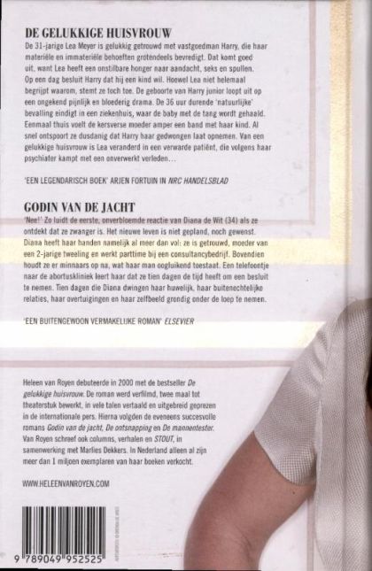 DE GELUKKIGE HUISVROUW De 31-jarige Lea Meyer is gelukkig getrouwd met vastgoedman Harry, die haar materiële en immateriële behoeften grotendeels bevredigt. Dat komt goed uit, want Lea heeft een onstilbare honger naar aandacht, seks en spullen. Op een dag besluit Harry dat hij een kind wil. Hoewel Lea niet helemaal begrijpt waarom, stemt ze toch toe. De geboorte van Harry junior loopt uit op een ongekend pijnlijk en bloederig drama. De 36 uur durende 'natuurlijke' bevalling eindigt in een ziekenhuis, waar de baby met de tang wordt gehaald. Eenmaal thuis voelt de kersverse moeder amper een band met haar kind. Al snel ontspoort ze dusdanig dat Harry haar gedwongen laat opnemen. Van een gelukkige huisvrouw is Lea veranderd in een verwarde patiënt, die volgens haar psychiater kampt met een onverwerkt verleden... GODIN VAN DE JACHT 'Nee!' Zo luidt de eerste, onverbloemde reactie van Diana de Wit (34) als ze ontdekt dat ze zwanger is. Het nieuwe leven is niet gepland, noch gewenst. Diana heeft haar handen namelijk al meer dan vol: ze is getrouwd, moeder van een 2-jarige tweeling en werkt parttime bij een consultancybedrijf. Bovendien houdt ze er minnaars op na, wat haar man oogluikend toestaat. Een telefoontje naar de abortuskliniek leert haar dat ze tien dagen de tijd heeft om een besluit te nemen. Tien dagen die Diana dwingen haar huwelijk, haar buitenechtelijke relaties, haar overtuigingen en haar zelfbeeld grondig onder de loep te nemen. Heleen van Royen debuteerde in 2000 met de bestseller De gelukkige huisvrouw. De roman werd verfi lmd, twee maal tot theaterstuk bewerkt, in vele talen vertaald en uitgebreid geprezen in de internationale pers. Hierna volgden de eveneens succesvolle romans Godin van de jacht, De ontsnapping en De mannentester. Van Royen schreef ook columns, verhalen en STOUT, in samenwerking met Marlies Dekkers. In Nederland alleen al zijn meer dan 1 miljoen exemplaren van haar boeken verkocht.