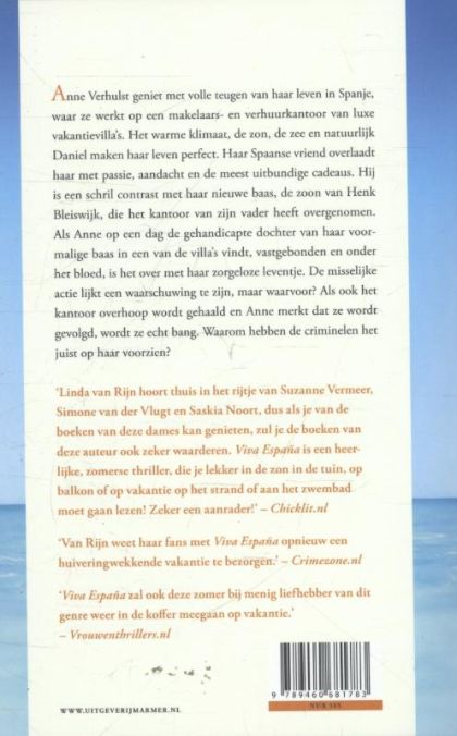 Anne geniet volop van haar relaxte leven als makelaar aan de Spaanse Costa. Een gruwelijke vondst in een van de villa's zet alles op zijn kop... Anne Verhulst geniet met volle teugen van haar leven in Spanje, waar ze werkt op een makelaars- en verhuurkantoor van luxe vakantievilla's. Het warme klimaat, de zon, de zee en natuurlijk Daniel maken haar leven perfect. Haar Spaanse vriend overlaadt haar met passie, aandacht en de meest uitbundige cadeaus. Hij is een schril contrast met haar nieuwe baas, de zoon van Henk Bleiswijk, die het kantoor van zijn vader heeft overgenomen. Als Anne op een dag de gehandicapte dochter van haar voormalige baas in een van de villa's vindt, vastgebonden en onder het bloed, is het over met haar zorgeloze leventje. De misselijke actie lijkt een waarschuwing te zijn, maar waarvoor? Als ook het kantoor overhoop wordt gehaald en Anne merkt dat ze wordt gevolgd, wordt ze echt bang. Waarom hebben de criminelen het juist op haar voorzien? Over Viva Espana: "Linda van Rijn hoort thuis in het rijtje van Suzanne Vermeer, Simone van der Vlugt en Saskia Noort, dus als je van de boeken van deze dames kan genieten, zul je de boeken van deze auteur ook zeker waarderen. Viva España is een heerlijke, zomerse thriller, die je lekker in de zon in de tuin, op balkon of op vakantie op het strand of aan het zwembad moet gaan lezen! Zeker een aanrader!" - CHICKLIT.NL "Van Rijn weet haar fans met Viva España opnieuw een huiveringwekkende vakantie te bezorgen." - CRIMEZONE.NL "Viva España zal ook deze zomer bij menig liefhebber van dit genre weer in de koffer meegaan op vakantie. - VROUWENTHRILLERS.NL