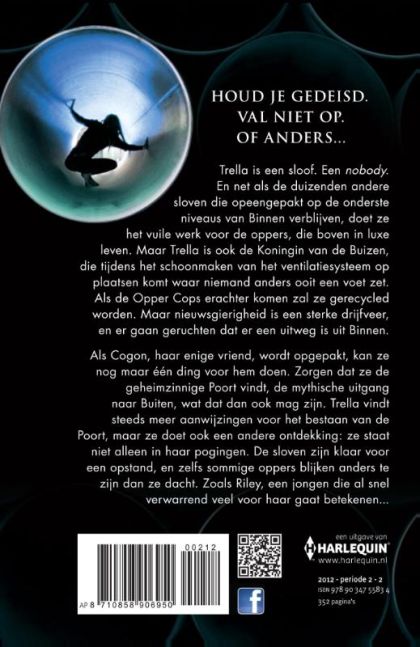 Houd je gedeisd. Val niet op. Of anders... Trella is een sloof. Een nobody. En net als de duizenden andere sloven die opeengepakt op de onderste niveaus van Binnen verblijven, doet ze het vuile werk voor de oppers, die boven in luxe leven. Maar Trella is ook de Koningin van de Buizen, die tijdens het schoonmaken van het ventilatiesysteem op plaatsen komt waar niemand anders ooit een voet zet. Als de Opper Cops erachter komen zal ze gerecycled worden. Maar nieuwsgierigheid is een sterke drijfveer, en er gaan geruchten dat er een uitweg is uit Binnen. Als Cogon, haar enige vriend, wordt opgepakt, kan ze nog maar één ding voor hem doen. Zorgen dat ze de geheimzinnige Poort vindt, de mythische uitgang naar Buiten, wat dat dan ook mag zijn. Trella vindt steeds meer aanwijzingen voor het bestaan van de Poort, maar ze doet ook een andere ontdekking: ze staat niet alleen in haar pogingen. De sloven zijn klaar voor een opstand, en zelfs sommige oppers blijken anders te zijn dan ze dacht. Zoals Riley, een jongen die al snel verwarrend veel voor haar gaat betekenen...