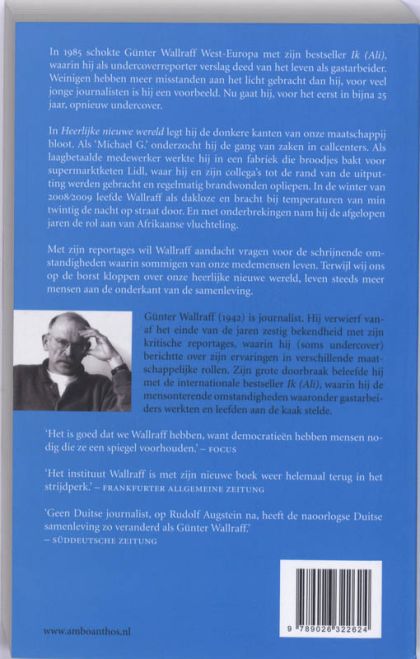 In 1985 schokte Günter Wallraff West-Europa met zijn bestseller Ik (Ali), waarin hij als undercoverreporter verslag deed van het leven als gastarbeider. In 'Heerlijke nieuwe wereld' gaat hij opnieuw undercover en legt hij de donkere kanten van onze maatschappij bloot. Als Michael G. onderzocht hij de gang van zaken in callcenters. Hij werkte in een fabriek die broodjes bakt voor supermarktketen Lidl, waar hij tot de rand van de uitputting werd gebracht en regelmatig brandwonden opliep. En hij leefde als dakloze, waarbij hij bij temperaturen van min twintig de nacht op straat doorbracht. Met zijn reportages wil Wallraff aandacht vragen voor de schrijnende omstandigheden waarin sommige van onze medemensen leven.